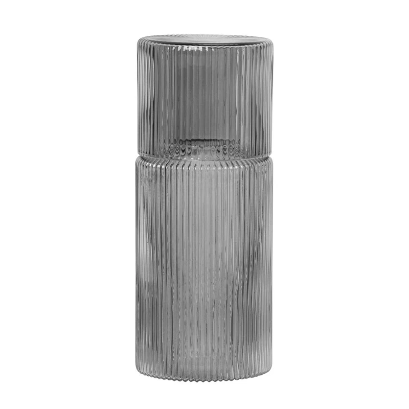L’ensemble carafe Ripple de ferm LIVING se compose d’une carafe d’un demi-litre et d’un verre qui fait également office de couvercle pour la carafe. Cet ensemble constitue un broc à eau élégant sur un bureau ou près du lit. L’aspect contemporain, mais intemporel, du verre ondulé se marie facilement avec de nombreux types de vaisselle.